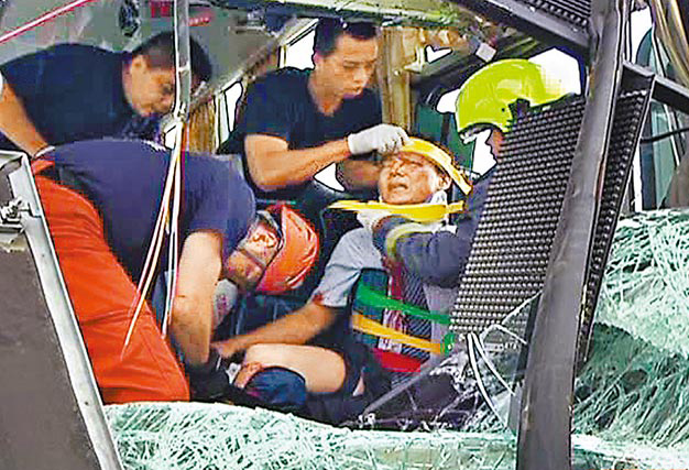 大客车司机被卡在驾驶座上,表情痛苦,警消人员急忙将司机救出送医。(图片来自台媒)
