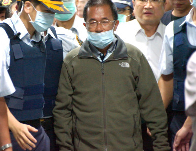 陈水扁(中)11日早着外套、内穿防弹背心,由台北监狱及警力团团戒护,到桃园医院检查。陈水扁脸色微泛暗沉、未发一语。(图片来自台媒)