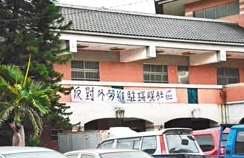 桃园县八德市瑞联社区反对外劳进驻,在社区外面贴上抗议布条表达立场。图片来源:台湾《中国时报》