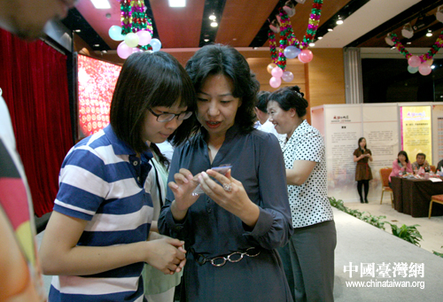 在联欢会上,北京市台联还向台生们赠送了北京市公交卡、稻香村月饼等小礼物。图为北京市台湾同胞联谊会办公室主任陈子云(台籍)向台生讲解公交卡使用方法。(中国台湾网 普燕摄)