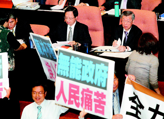 台“立法院”昨天举行“院会”,虽然台当局“行政院”已宣布电价缓涨,民进党“立院”党团仍于“院会”正式提出对台当局“行政院长”陈冲不信任案,台联党团也予以支持,两党于议场内高喊“换‘内阁’、救经济”,台当局“行政院长”陈冲(后右一)也因此无法上台进行施政报告。图片来源来源:台湾《联合报》