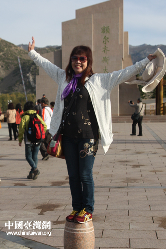 台湾中南部乡镇里长新疆兵团参访团成员在可可托海风景区合影留念。(中国台湾网 高斯斯 摄)