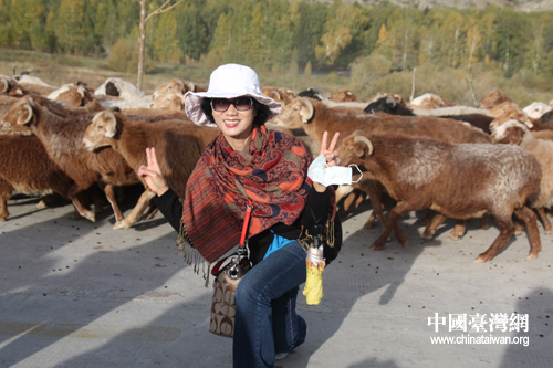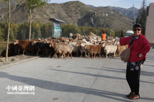 台湾中南部乡镇里长新疆兵团参访团成员与牧区羊群合影留念。(中国台湾网 高斯斯 摄)