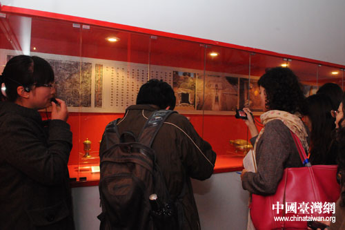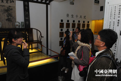 图为两岸记者参访蒙顶山世界茶文化博物馆,听导游讲解茶叶的知识、茶的历史及茶文化艺术等。(四川省台办供图)