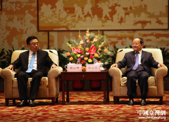 9月22日晚,中共江西省委副书记、江西省长鹿心社在南昌会见了全国台湾同胞投资企业联谊会会长郭山辉等前来参加2012“赣台会”的台湾嘉宾。(中国台湾网 王思羽 摄)