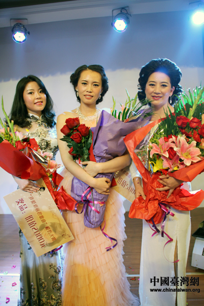 “我爱邓丽君歌曲模仿大赛”三甲合影,左起杜佳瑶、潘蓬、于红萍。(中国台湾网 吴怡 摄)