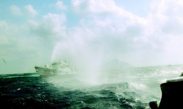 台湾南方澳渔船接近钓鱼岛(前方小岛)约3、4海里时,日本海上保安厅的巡逻船朝台湾渔船喷水驱赶。图片来源:台湾《联合报》