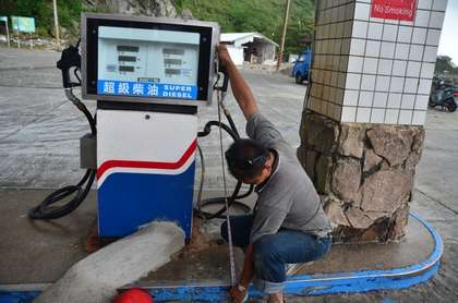 兰屿乡公所将日前被台风“天秤”重创的唯一加油站进行固定作业,防范加油机再被巨浪冲毁。(图片来自台媒)