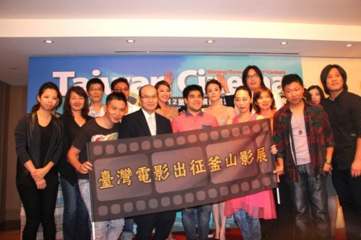 各剧组人员一同举旗,宣示“台湾电影出征釜山影展”。(图片来自台湾“今日新闻网”)