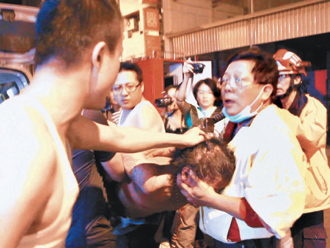 台湾一男子因同居女友分手,挟持并刺伤亲生幼儿,目击男子(左)气得抓着他的头挥拳。(图片来源:台湾《联合报》)