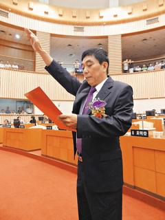 屏东县议长黄国安一个月来当选2次,昨天上午终于宣誓就职。(图片来源:台湾《联合报》)