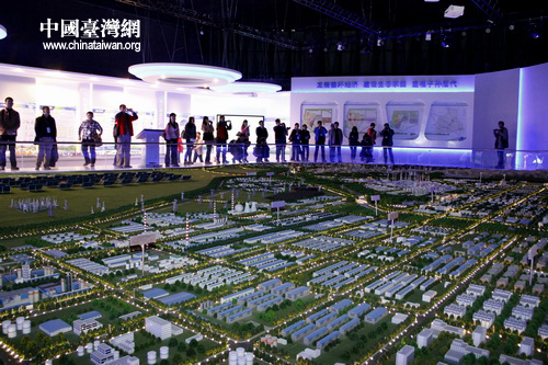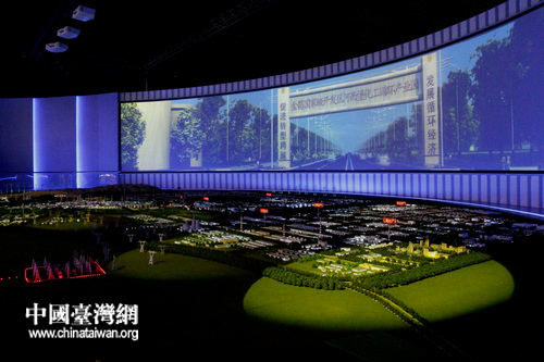10月23日,“感知甘肃”第四届网络媒体采访团参观考察金昌市循环经济发展状况。 图为采访团记者参观金昌市循环经济展览馆所展出的城市规划图及沙盘。 (中国台湾网 董宪超 摄)