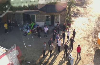 新竹新埔镇镇代会王姓主席,不满拆迁户私下找承包商拆屋,派多名手持棍棒的手下到场,厉声要求民众下楼谈话。(图片来自台媒)