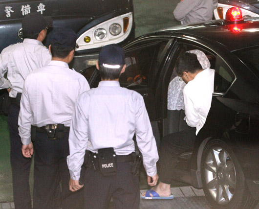 前台当局“行政院秘书长”林益世(右)昨天遭台特侦组依贪污罪起诉,并在警方的戒护下移审台北地院开接押庭,林益世下车时刻意避开媒体镜头,以螃蟹横行的方式进入地院开庭。 图片来源:台湾联合新闻网