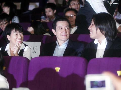 马英九(中)28日与龙应台(左)、导演张荣吉(右)一起观看影片《逆光飞翔》。(图片来自台媒)