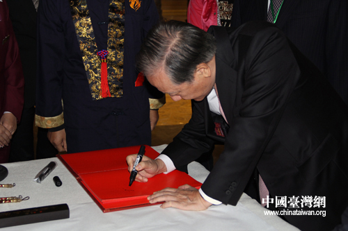 新党主席郁慕明在祈福仪式上题字签名。(中国台湾网 陈睿 摄)