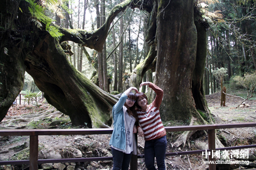 台湾“姐妹花”在阿里山“同心木”合影留念。(中国台湾网 于斯文 摄)