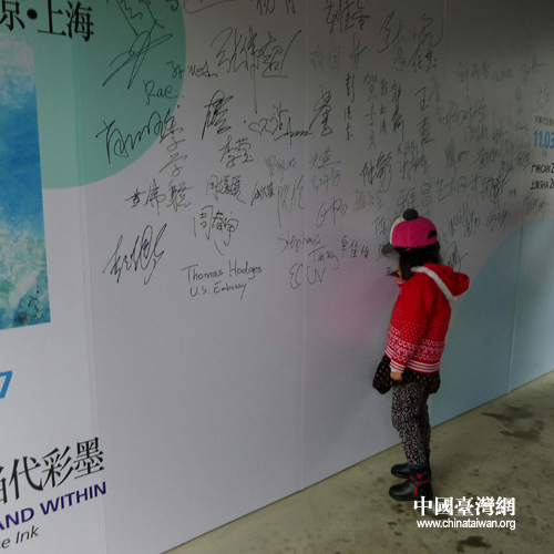 虞兰因画展在京开幕,小观众看板上在签名留念 (摄影 吴小珊)