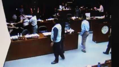 中国台湾网11月13日消息 据台湾媒体报道,桃园县龙潭乡代表会今日总质询,乡代表古铭洲质询过程中,乡长叶发海抢着要发言,遭古拍桌制止,叶见状也拍桌示威,2人走到议场中间发生推挤,双方人马赶忙上前劝阻,期间7、8人互相推打,多人因而挂彩。