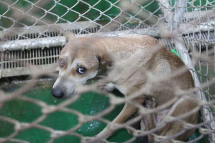 流浪狗被关在铁笼里神情落寞。(图片来自台媒)