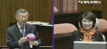 杨玉欣今日的另类质询难倒了陈冲(左)。来源:台湾TVBS电视台
