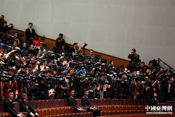 11月14日,中国共产党第十八次全国代表大会闭幕会在北京人民大会堂举行。 图为记者在采访拍摄。(中国台湾网 王伟 摄)