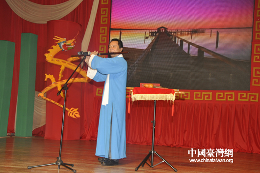 老艺术家连续吹奏葫芦丝、笛子等乐器,博得阵阵掌声。(中国台湾网 发)