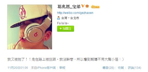 就在前天(19日)晚间一直到第二天凌晨,宝弟又再一次被平面媒体直击出没在台北市东区的夜店,他似乎也发现自己被跟拍,于20日的凌晨1:06在微博留言道:“我又被拍了!!走在路上被狂跟。我没干么,所以看到报道不用大惊小怪。”父亲生病,他却还有心情上夜店?而且重点是未成年的他怎么能在外头搞到快1点还在玩乐,实在叫人傻眼。(中国台湾网 周剑)