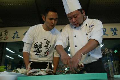 厨师教导阮经天如何“宰蟹”。图片来自台媒