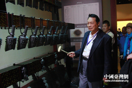 台湾嘉宾尝试敲打编钟(中国台湾网 黄艳艳 摄)