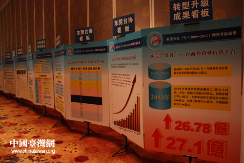 论坛现场的宣传展板,以图文并茂的形式展示东莞台资企业转型升级诊断辅导工作情况。(中国台湾网 马萌 摄)