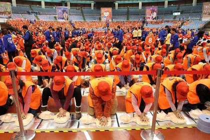 桃园县上万民众在体育馆挑战吉尼斯世界纪录。(图片来自台媒)