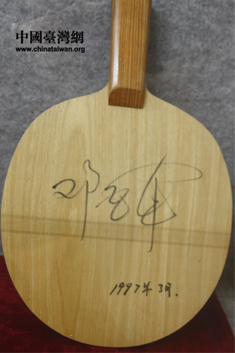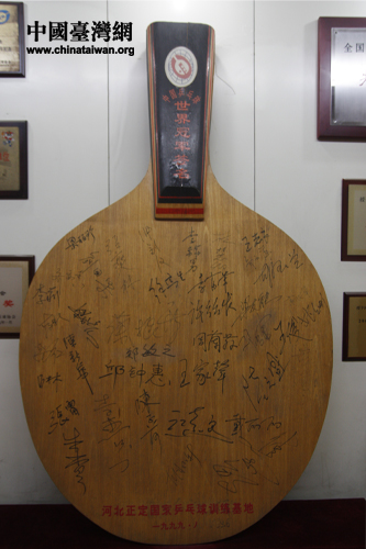 正定国家乒乓球训练基地内展出写有邓亚萍签名的乒乓球拍。(中国台湾网 焦源源 摄)
