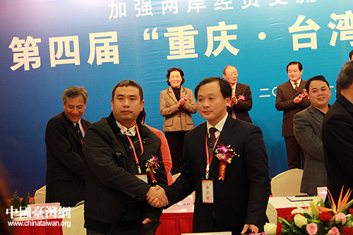 第四届“重庆·台湾周”合作项目签约仪式上,重庆7个区县与台商签订29项合作协议,投资总额达290多亿元人民币。(中国台湾网 杨丽 摄)