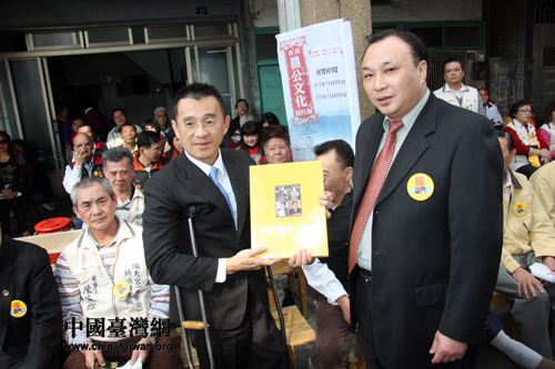 《两岸关系》杂志社工作人员向台中市副市长徐中雄赠送纪念品。(中国台湾网发 戚泉 摄)