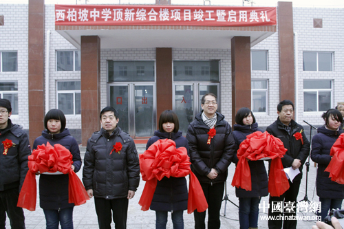 12月28日,由顶新公益基金会参与援建的河北平山县西柏坡中学综合楼竣工启用,图为腾鸿年理事长等在启用仪式上剪彩(中国台湾网记者 芜同 摄)