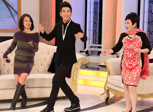 张晓龙(中)活泼跳舞,连张小燕(右)也忍不住一起共舞。(来源:中天新闻)