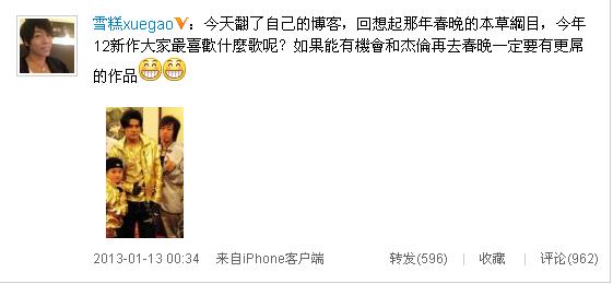 黄心昱在微博透露,若再与周杰伦合作登陆春晚,一定要有更好作品(图片来源:微博截图)