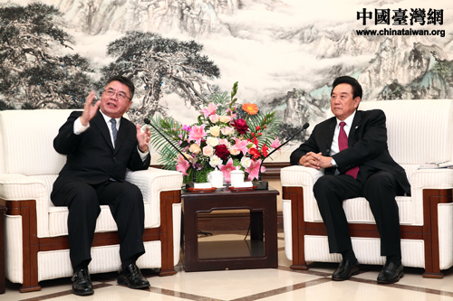 21日下午,海峡两岸关系协会会长陈云林(右)在北京会见了来京交流的广东东莞台商子弟学校董事长叶宏灯(左)及其率领的该校校董、师生与家长代表。(中国台湾网 于斯文 摄)