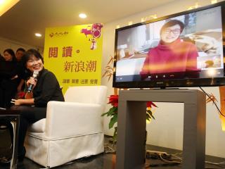 台当局“文化部长”龙应台(左前)邀请影星林青霞(图右屏幕)担任“文化大使”,推广阅读风气,23日下午两人视讯联机,一同号召民众加入阅读行列。图自台媒