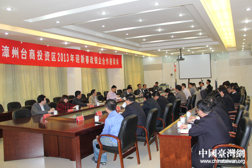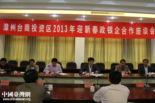 中国台湾网1月25日漳州消息 日前,福建漳州台商投资区召开2013年迎新春政银企合作座谈会,会议以帮助企业、项目解决资金困难及银行扩大存贷款规模,加强政府、银行、企业的沟通与交流,促进银行和企业双赢为主题。台商投资区领导、区直有关部门,厦门银行、招商银行和交通银行的漳州分行等多家金融机构以及企业代表共40多人参加会议。