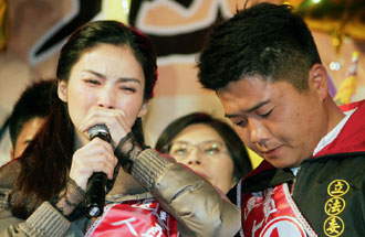 颜宽恒妻子陈丽凌(左)用泪水真情催票。(图片来源:台湾“联合新闻网”)