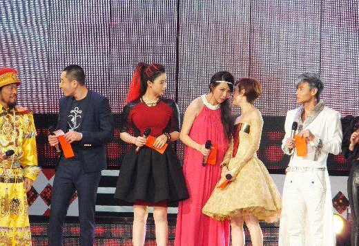 今年的压轴大戏由“甄嬛帮”一手包办,孙俪、蒋欣、李东学、蔡少芬4人除了轮番接唱,蒋欣还首度在台湾演唱偶像张惠妹的《姐妹》,最后更与孙俪一起与扮演皇帝的张菲互动。不过“皇后”蔡少芬、“华妃”蒋欣和“甄嬛”孙俪,在台上丝毫不见剧中的烟硝味,蒋欣也没和“死对头”孙俪死掐,3个女生在台上叽叽喳喳不停聊天,感情热络。