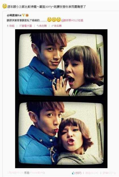 24日柯震东就在微博发了和Hold住姐正常版的合照。图自台媒