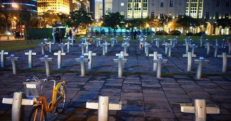 台北市政府交通局交通治理科表示,公用自行车需要透过停车柱来计费、停靠,一根停车柱可停靠两辆自行车,所以造型设计有点像“十字架”。网络上的照片是拍到自行车大多被租出的景象,又因灯光色调问题,才造成外观有点像“墓地”。(中国台湾网 焦源源)