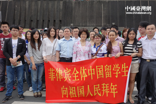 中国驻菲律宾大使馆马克卿大使、潘峰参赞和海峡两岸留学生在一起(图片来源:中国台湾网)