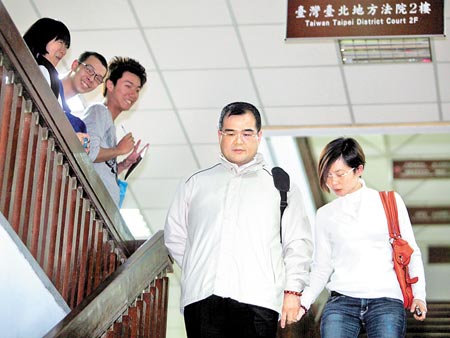 林益世贪污索贿案,台北地院4日开庭询问洗钱流程,庭讯直到傍晚5点多结束,旁观民众笑着看他与妻子彭爱佳牵手离开法院。(图片来源:台湾《中国时报》)