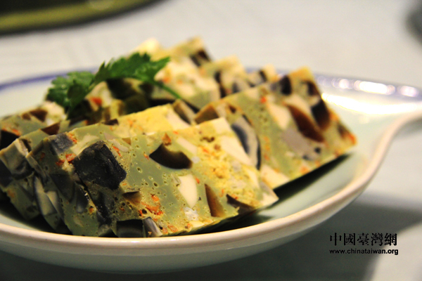 松花蛋、柴鸡蛋和咸鸭蛋的组合,上面撒上少许朝天椒,清爽微辣。做法出自台湾画家黄木村。在主菜上来前,这样一道下酒菜可是必不可少的。