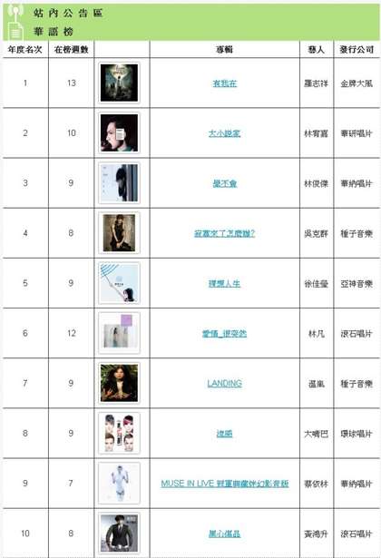 中国台湾网2月18日消息 据台湾媒体报道,台湾中广音乐网i Radio 2012年度华语金曲榜揭晓,罗志祥专辑《有我在》进榜13周,荣登王座,亚军则是林宥嘉的《大小说家》,林俊杰《学不会》在榜9周,摘走季军。