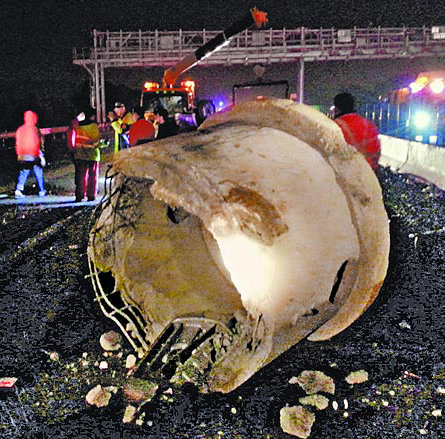 联结车的子车脱落翻倒,车上重2公吨的水泥管滚到路中酿祸。(图片来自台媒)